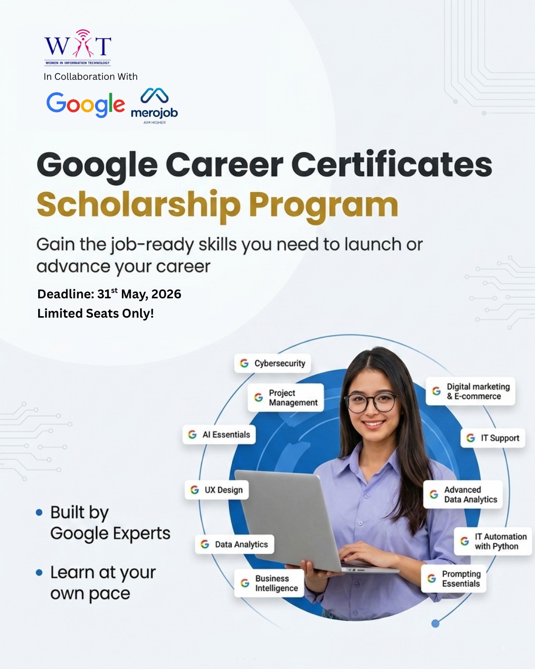 Women in Information Technology (WIIT), in collaboration with Google LLC & Mero Job Limited, is pleased to announce the opportunity to apply for the Google Career Certificates scholarship program. This initiative targets individuals with a genuine interest in advancing their competencies and qualifications, particularly in the dynamic IT and technology sectors, and aims to provide global competencies to equip them with the necessary skills.